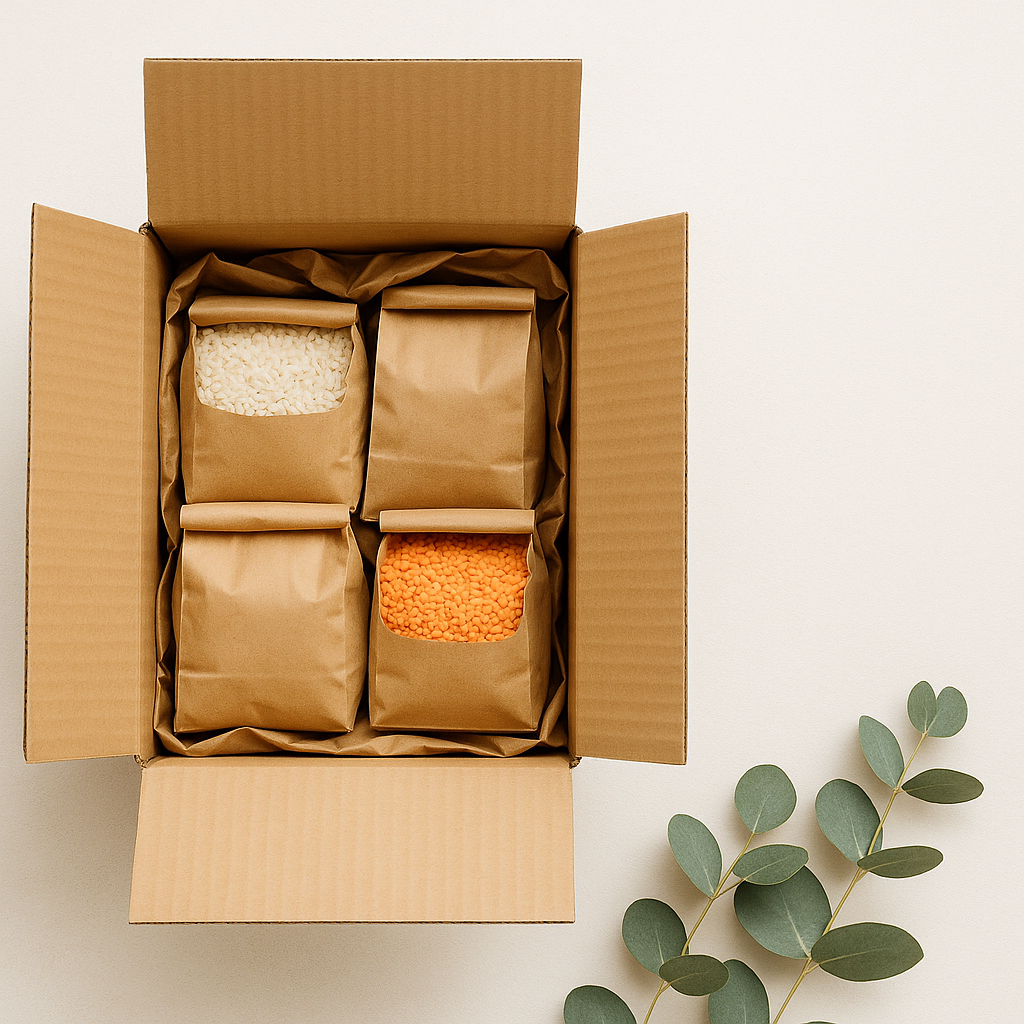 Deine Bestellung erreicht dich sicher in einer Verpackung, die zu 100 % ins Altpapier darf. Wir verzichten komplett auf Plastik und setzen auf natürliche, recycelbare Materialien. So schützt du nicht nur deine Lebensmittel, sondern auch unseren Planeten – ein Paket nach dem anderen